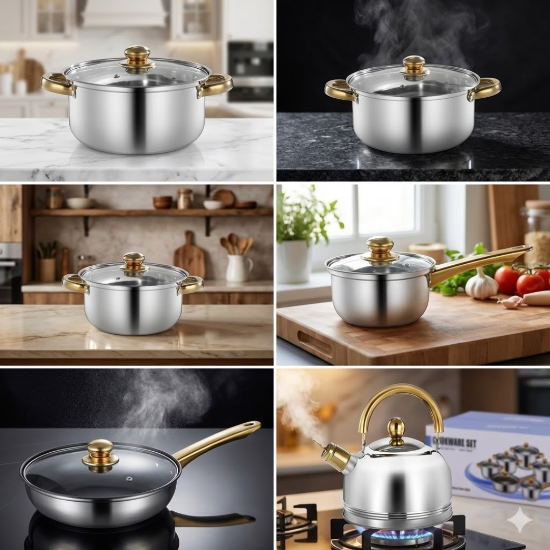 El Juego de Ollas Premium de Acero Inoxidable fue diseñado para quienes cocinan con frecuencia y exigen resultados consistentes, control térmico y acabado superior. Cada pieza está pensada para un uso diario intensivo, sin perder elegancia.